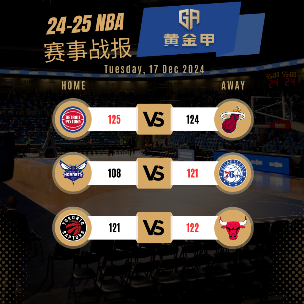 黃金甲体育给你每天 NBA 战报,今天有6场赛事,来看看活塞主场对阵热火的赛事,虽然最近身陷交易流言的巴特勒成为史上首位砍下35分、19篮板、10助攻、4次抢断且0失误的球员,无奈最后战到延长加时,还是以124-125败给活塞,其他比赛分别为七六人以121-108戰勝黄蜂,公牛以122-121战胜猛龙。