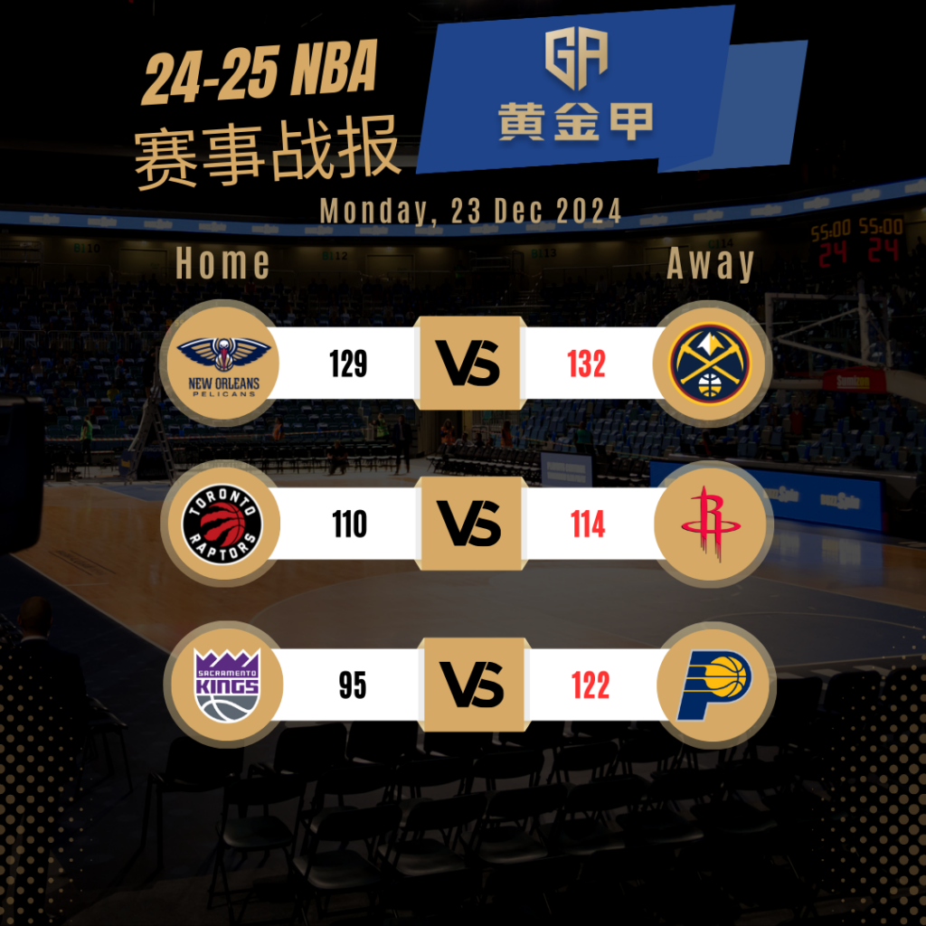 黃金甲体育给你每天 NBA 战报,今天有三場賽事,来看看掘金在客场对阵鹈鹕的赛事,前三节打完还领先的鹈鹕在第四节遭到掘金逆转,最后遭到贾马尔默里跳投追平,经历一个加时赛,掘金就以132-129战胜鹈鹕,让后者遭遇7连败。其他赛事分别为火箭以114-110战胜猛龙,步行者以122-95战胜国王。