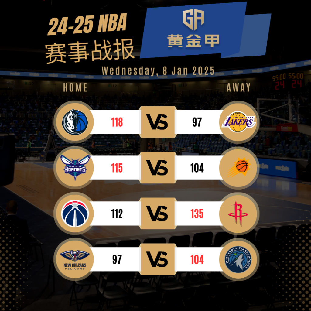 黃金甲体育给你每天 NBA 战报,今天一共有7場賽事,首先来看独行侠在主场对阵湖人的赛事,在欧文与东契奇双双缺阵情况下,独行侠本场比赛只能以残阵出赛,但靠着板凳格兰姆斯23分9板6助表现,最后居然以118-97击败湖人,终结五连败。其他赛事分别为黄蜂以115-104战胜太阳,成功终结十连败,火箭以135-112战胜奇才,森林狼以104-97战胜鹈鹕。