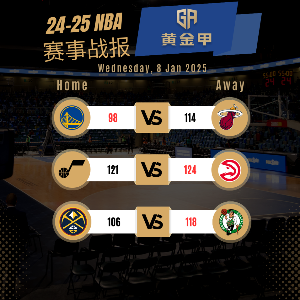 接着来谈热火客场对阵勇士的赛事,背靠背且昨天与国王战至双加时的热火,依旧也是靠着板凳球员发挥以及防守的发挥,限制住勇士的进攻,最后就以114-98战胜勇士,终结三连败,而库里在勇士大幅度落后遭换下时,在替补席失落盖毛巾,其他赛事分别为老鹰以124-121战胜爵士,凯尔特人以118-106战胜掘金。