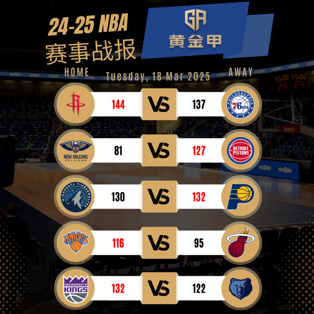 黄金甲体育 给你每天 NBA 战报,今天一共有10场赛事,来看火箭在主场对阵76人的赛事,本场比赛火箭曾经落后给对手25分,但他们在第三节打出45:24的攻势,且在最后30秒追回6分,靠着申京补篮绝平进加时,最后火箭就以144:137险胜76人,完成队史最大比分逆转记录,继续维持7连胜。