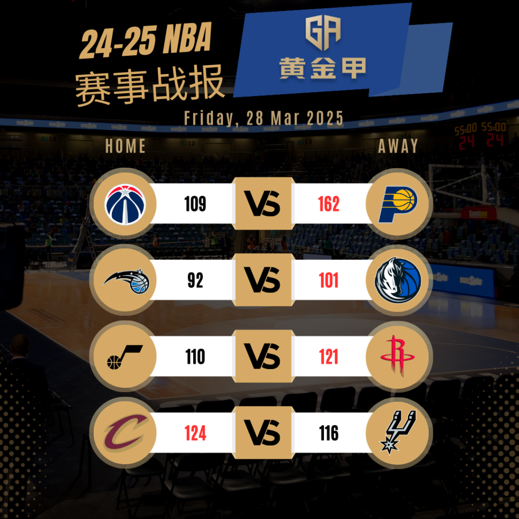 本日其他赛事分别为,骑士以124:116战胜马刺,独行侠以101:92战胜魔术,热火以122:112战胜老鹰,雷霆以125:104战胜灰熊,火箭以121:110战胜爵士,国王以128:107战胜开拓者。