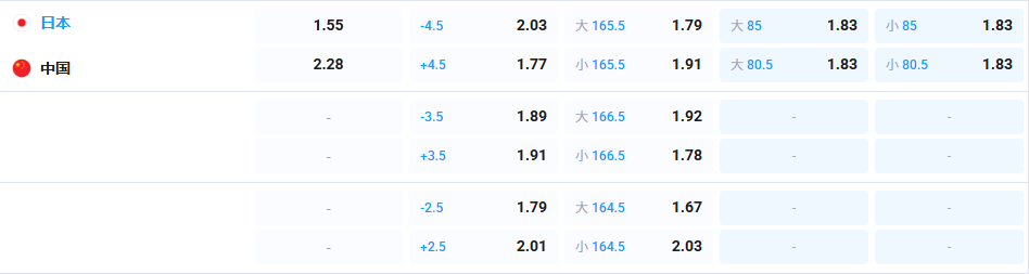 从目前的盘口和市场赔率来看,博彩公司给出了日本队让 4.5 到 5.5 分的初盘。虽然日本队缺少了八村塁和河村勇辉,但市场显然更看好其成熟的战术体系和主场加持。