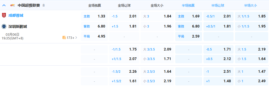 - 全场让球: 成都蓉城 -1.5 @ 2.01