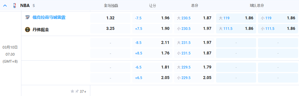 分析内容: 数据层面观察,外界主流厂家初始主胜数值设定在1.32左右,主让数值开在7.5至8.5分区间,显示出对雷霆的信心,初始总分值集中在230.5至231.5分。历史交锋近 10 次对决掘金 3 胜 7 负,完全被雷霆压制,最近几次客场交手,掘金 127:121、125:93 连续输球,甚至被轰出 149:106 的大比分,心理上处于绝对劣势。即便是掘金客战雷霆的同主客交锋,近 10 场也仅 3 胜 7 负,完全处于下风。