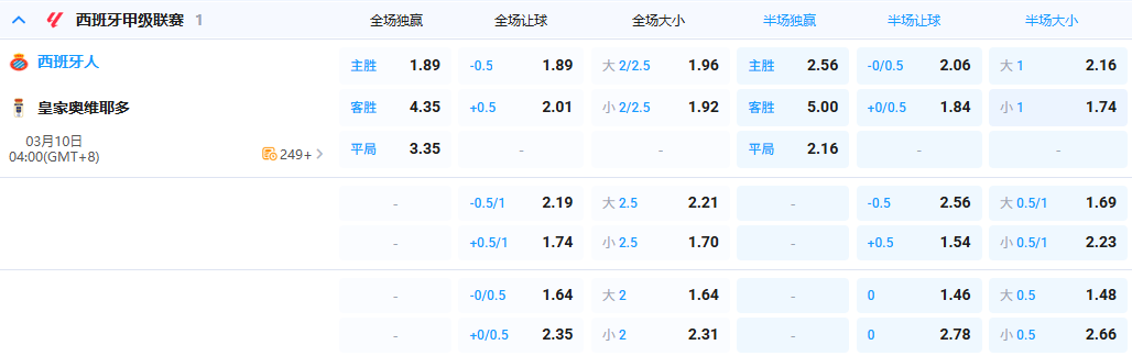 数据初盘开出主队-0.5,说明机构对西班牙人实力的认可。西班牙人本赛季10胜6平10负,积36分排名联赛第7位。曾经那个令人惊喜的黑马,如今遭遇近5轮不胜。阵容深度不高,让球队面临体能瓶颈的尴尬境地。反观皇家奥维耶多本赛季积17分排名垫底,深陷降级区无法自拔。表现极差,进攻火力严重匮乏整个赛季仅打进16球。综合分析虽然西班牙人近期表现不太理想,但整体实力远高于皇家奥维耶多。本场看好西班牙人逆转颓势,主场取胜。