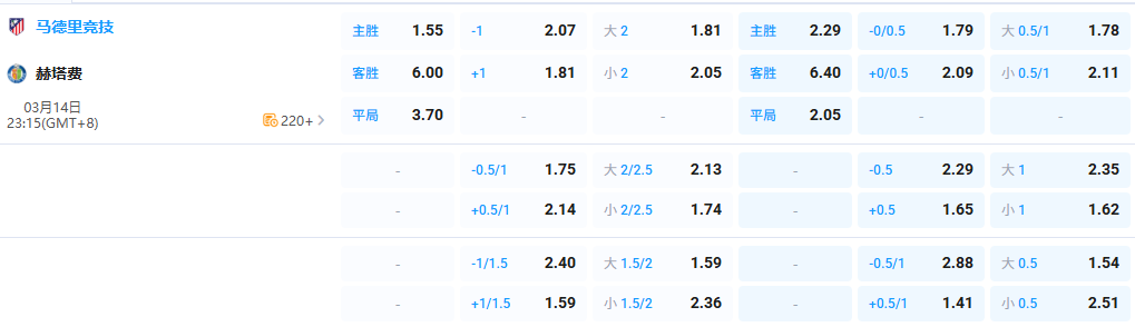 数据方面对于主队主场后续拿分能力给予较大认可,盘口开出主队让 1 球。马竞整体实力与阵容深度明显占优,球队在主场作战时向来战斗力十足,防守体系稳固,同时反击效率颇高,面对中下游球队往往具备较强掌控力。赫塔费近期状态有所提升,但整体能力较为有限,面对马竞这样防守严密且经验丰富的对手,想要取得突破难度不小。综合双方实力与主客场因素来看,马德里竞技优势明显,本场更看好主队稳扎稳打拿下三分。