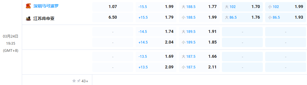 - 全场让球: 江苏肯帝亚 +15.5 @ 1.79