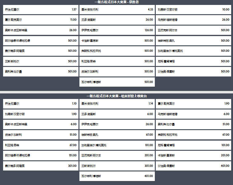 3/25 F1日本站 赛事赔率