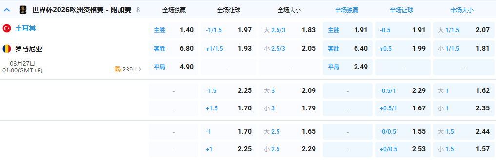 【1点整 世欧预 土耳其 vs 罗马尼亚】