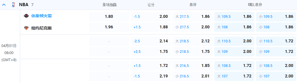 数据初盘开出主队-1.5。说明对火箭近况的些许认可。连续战胜了弱旅灰熊队和鹈鹕队之后,火箭队已经迎来两连胜。他们目前排名西部第六,火箭队基本上已经锁定了季后赛门票,不过他们一定要多赢球,否则可能会跌入附加赛。尼克斯虽说目前位居第三,但为了避免次轮对阵塔图姆回归的凯尔特人,会不会故意跌至第四,这将会是观察重点,综合情况看来,看好火箭在主场取胜,但预估两队分数将会相对小一点