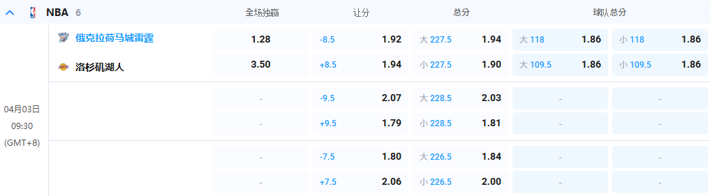 【9点30分 NBA 俄克拉荷马城雷霆 vs 洛杉矶湖人】