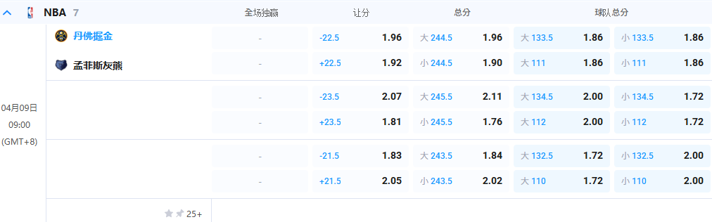 数据初盘开出主队让22.5,相当看好掘金。西部第三的丹佛掘金主场迎战已无缘季后赛的孟菲斯灰熊。一边是豪取9连胜、全力冲击更高排位的冠军级劲旅,一边是深陷史诗级伤病潮、以发展联盟阵容应战的摆烂之师。本场比赛既是掘金巩固排名、延续连胜的关键战,也是灰熊锻炼年轻球员的练兵局,两队近10次交锋,掘金8胜2负,占据优势,不过掘金仅需拿下胜利,保留球员状况才是关键,而灰熊为了选秀顺位依旧在努力,看好掘金赢球输盘,分数不会过于巨大