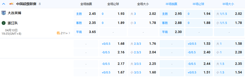 - 全场让球:大连英博0 @1.93