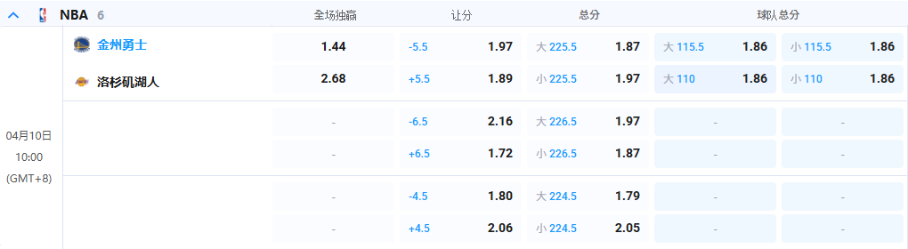 - 全场让球: 湖人 +5.5@1.89