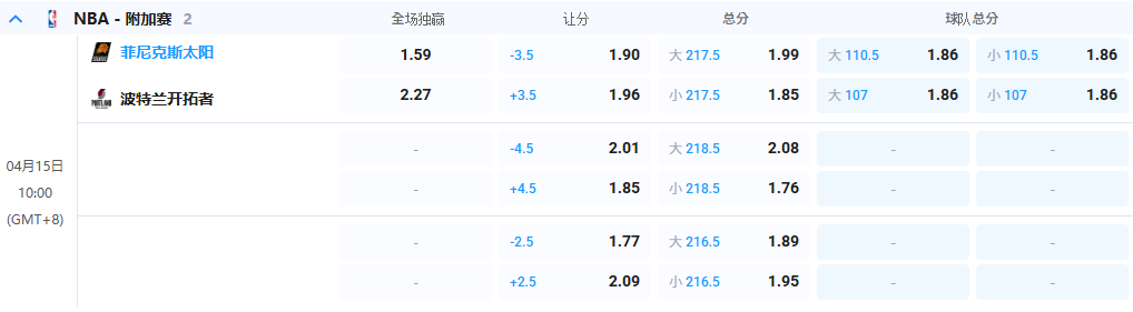 • 全场让分: 菲尼克斯太阳 -3.5 @ 1.90