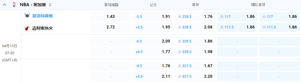 • 全场让分: 迈阿密热火 +5.5 @ 1.95