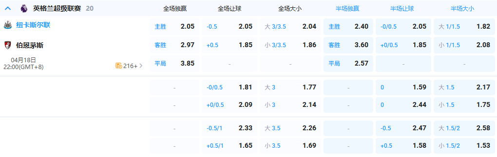 【22点整 纽卡斯尔联 vs 伯恩茅斯】