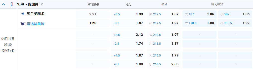 - 全场让分:夏洛特黄蜂 -3.5 @ 1.87