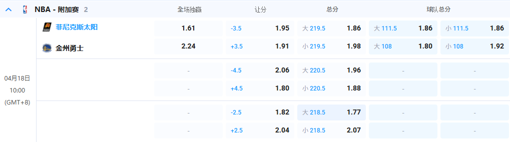 - 全场让分:金州勇士 +3.5 @ 1.91