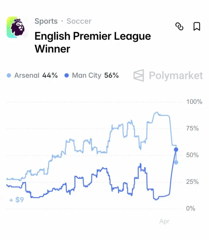 polymarket给出了最新的夺冠概率,曼城56%反超阿森纳,枪手最新的概率是44%,整整一个月之前,阿森纳的夺冠概率还是91%,曼城当时只有9%。