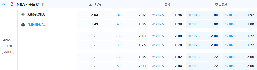 • 全场让分:洛杉矶湖人 +4.5@2.02