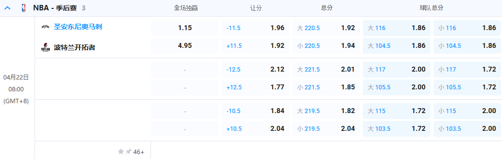 • 全场让分:圣安东尼奥马刺 -11.5@1.96