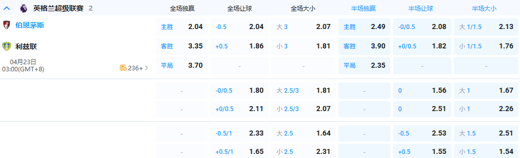 【3点整 英超 伯恩茅斯 vs 利兹联】