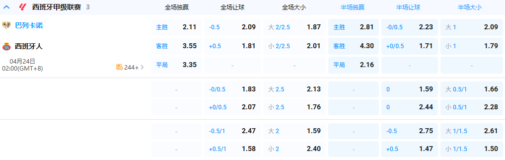 - 全场让球:巴列卡诺-0.5 @ 2.09