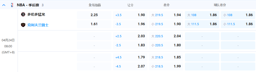 - 全场让分:克利夫兰骑士-3.5@ 1.96
