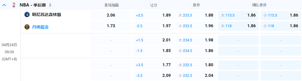 - 全场让分:明尼苏达森林狼+2.5@1.89