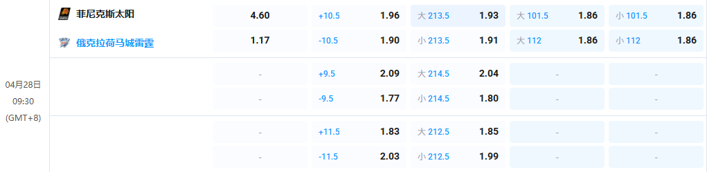 - 全场让分:俄克拉荷马城雷霆 -10.5 @ 1.90