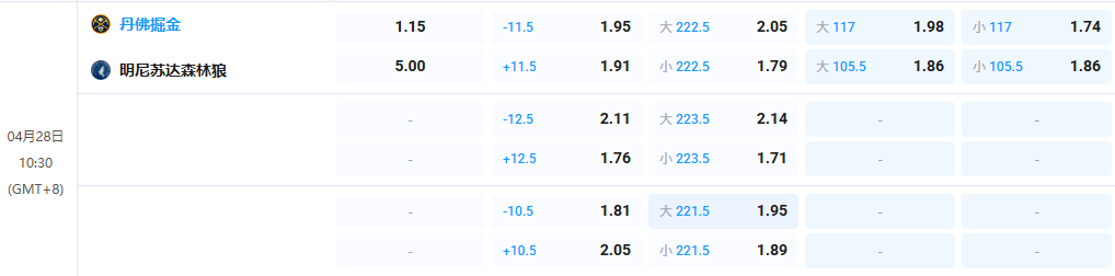 - 全场让分:丹佛掘金 -11.5 @ 1.95
